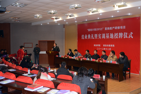 12月12日上午,我院举行“国培计划(2012)”置换脱产研修项目结业典礼暨实训基地授牌仪式。院纪委书记、学院“国培计划”和省级培训项目领导小组副组长王思怀,商洛市教育局副局长白发善,陕西省“国培计划”项目执行办公室项目部主任苏理、副主任罗昆山,我院中文系主任、学院“国培计划”和省级培训项目领导小组成员黄元英,数学与计算科学系主任、学院“国培计划”和省级培训项目领导小组成员李超,商洛市教育局基础科科长张斌出席了仪式。仪式由我院成人教育学院院长任少俭主持。