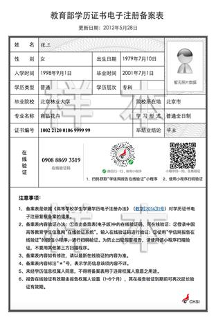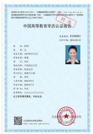 2.对于往届考生,网报学历校验通过的,只提供毕业证书照片;网报学历校验未通过的还须提供“中国高等教育学生信息网”的《教育部学历证书电子注册备案表》或《中国高等教育学历认证报告》。示范图片如下: