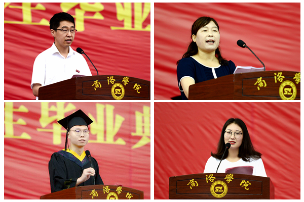 教师代表、建工学院赵培博士,毕业生家长代表冯亚娣,在校生代表、艺术学院学生张倩分别作了发言,为毕业生们送去美好祝福和良好祝愿。电信学院学生邢逸飞代表全体毕业生感谢母校的培育和师长的教导,表示将不忘初心、勤奋拼搏,努力用学校所学回报社会,为母校争取荣光。