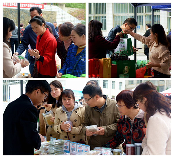启动仪式结束后,各参与企业纷纷展示面粉、豆类、有机茶、土鸡蛋、生鲜蔬菜等农特产品,这些富有地方特色、经济实惠的产品很受欢迎,师生在展销摊位前咨询了解,踊跃购买,各企业忙着介绍宣传,分类包装,现场异常热闹。