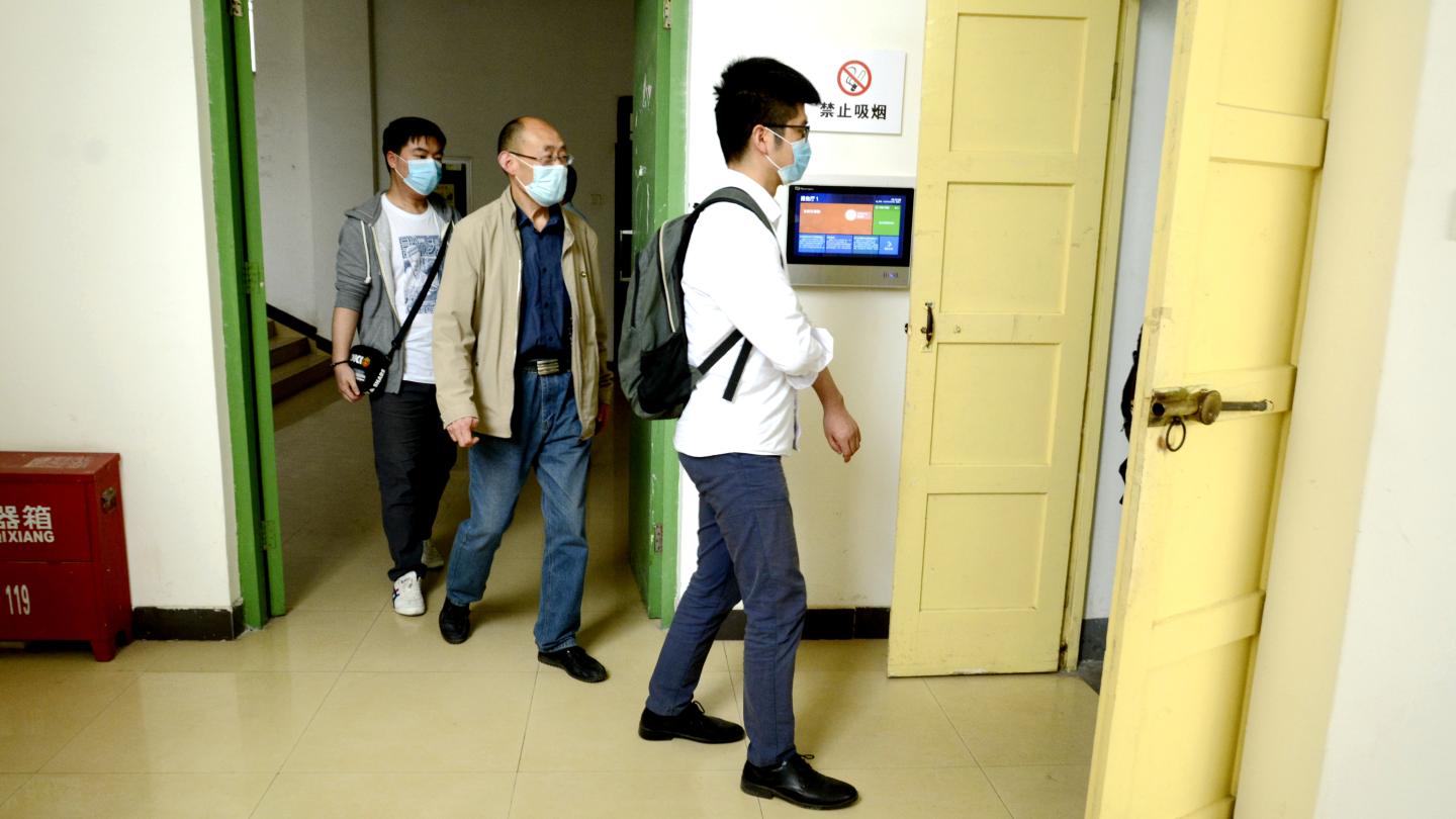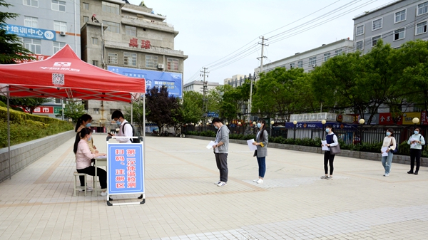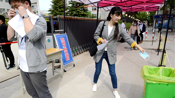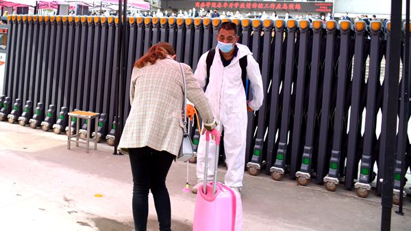随着龙治刚“演练开始”一声令下,紧张有序的演练正式拉开帷幕,几十余名“学生”在学校大门口外保持1.5米间隔依次进入消毒通道,卸下旧口罩投弃到专用垃圾箱后佩戴工作人员配发的一次性医用口罩,经工作人员查验有效证件后进入校门口自动测温门,进行第一次体温检测。体温检测正常的学生按照指示线到一号教学楼前的各学院接待点接受二次体温检测、扫描验证健康二维码、填写健康承诺书。