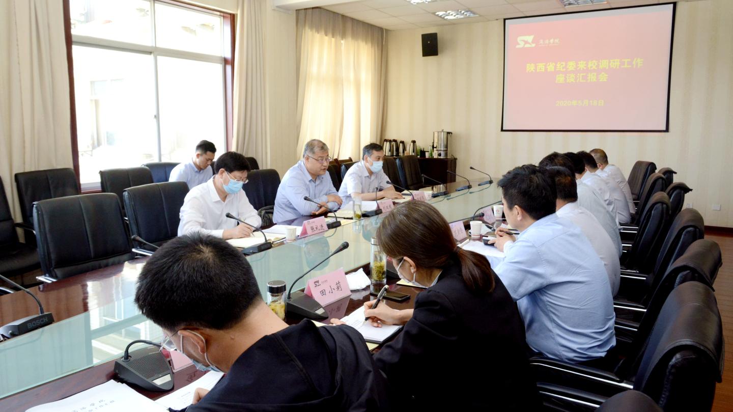 5月18日,省纪委常委刘双耀、省纪委监委第四监督检查室主任韩明军一行来校调研指导工作,商洛市委常委、市纪委书记张礼进陪同调研。bat365党委书记龙治刚,党委副书记、校长范新会,党委副书记彭虎军,党委副书记、纪委书记曹渊参加调研并出席座谈会。座谈会由范新会主持。