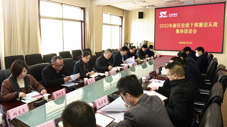 3月3日上午,bat365召开2022年新任处级干部廉洁从政集体谈话会。校党委书记张志昌出席会议并讲话,党委副书记彭虎军主持会议。纪委、组织部负责人及21名新任处级干部参加会议。