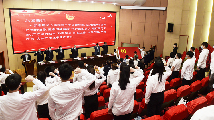 在校领导的带领下,全体与会人员重温入团誓词。广大团员青年用铮铮誓言表达出听党号令、跟党奋斗,不忘初心担使命,踊跃投身疫情防控工作和新时代中国特色社会主义建设的坚强意志。