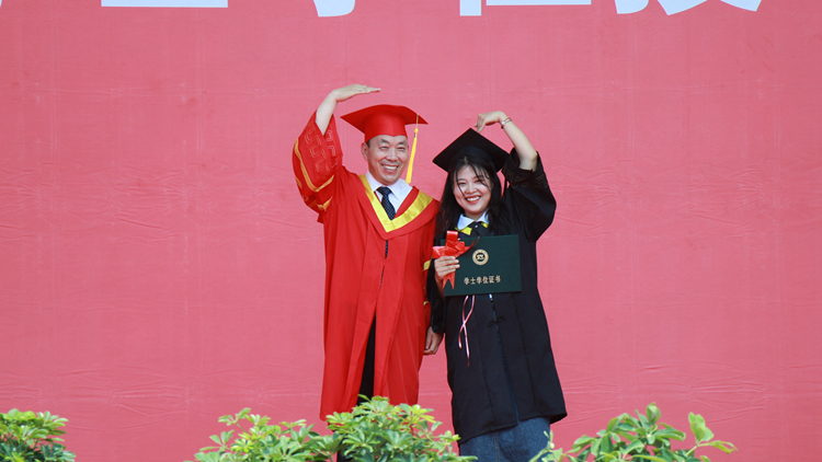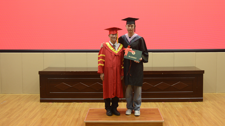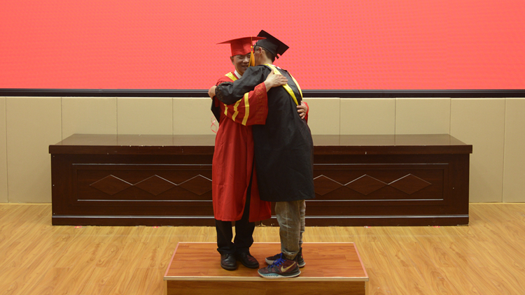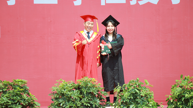 毕业典礼在校歌《正道直行做栋梁》中圆满结束,学位授予仪式分别在北新街校区体育场、图书馆二楼报告厅和丹江校区体育馆同时进行。毕业生们依次上台,由校领导范新会、彭虎军、刘宝盈、王新军为获得学士学位的毕业生正冠拨穗,颁发学位证书,并与同学们一一合影留念。