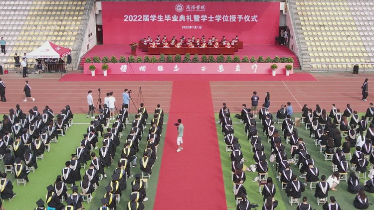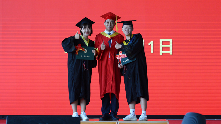7月1日上午,bat365隆重举行2022届学生毕业典礼暨学士学位授予仪式。校领导张志昌、范新会、彭虎军、刘勇、刘宝盈、王新军、郭瑾出席典礼。3000余名2022届毕业生通过线上线下结合的方式,在北新街校区和丹江校区同时参与,同上最后一堂“思政大课”。师长的谆谆教诲、毕业生代表深情演唱的歌曲、“奉献基层、服务边疆”优秀毕业生现场登台领奖……这场充满思政元素的毕业典礼,激发毕业生们深怀爱国之心、砥砺报国之志、勇挑强国重任。