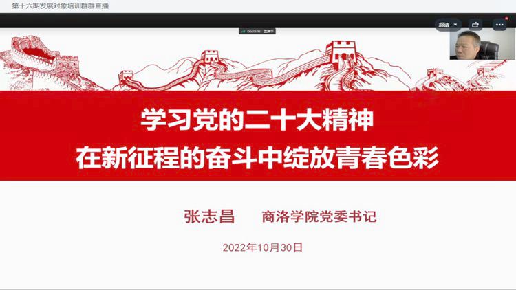 张志昌以《学习党的二十大精神——在新征程的奋斗中绽放青春色彩》为题,从“大会盛况、党的二十大报告主要内容、青年大学生如何学习好贯彻好党的二十大精神”三个方面解读党的二十大报告精神,并重点介绍了党的二十大重大深远的历史意义、党的二十大主题中蕴含的丰富内涵、全面深刻把握习近平新时代中国特色社会主义思想的世界观和方法论、新时代青年使命担当等内容。张志昌勉励全体发展对象要认真学习贯彻党的二十大精神,牢记党的嘱托、党的教育,不负韶华,不负时代,不负人民,努力成为有理想、敢担当、能吃苦、肯奋斗的新时代好青年,为全面建设社会主义现代化国家、全面推进中华民族伟大复兴作出新的更大贡献。