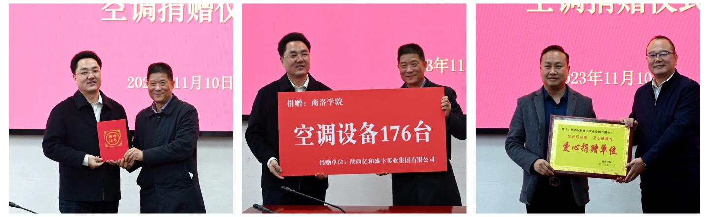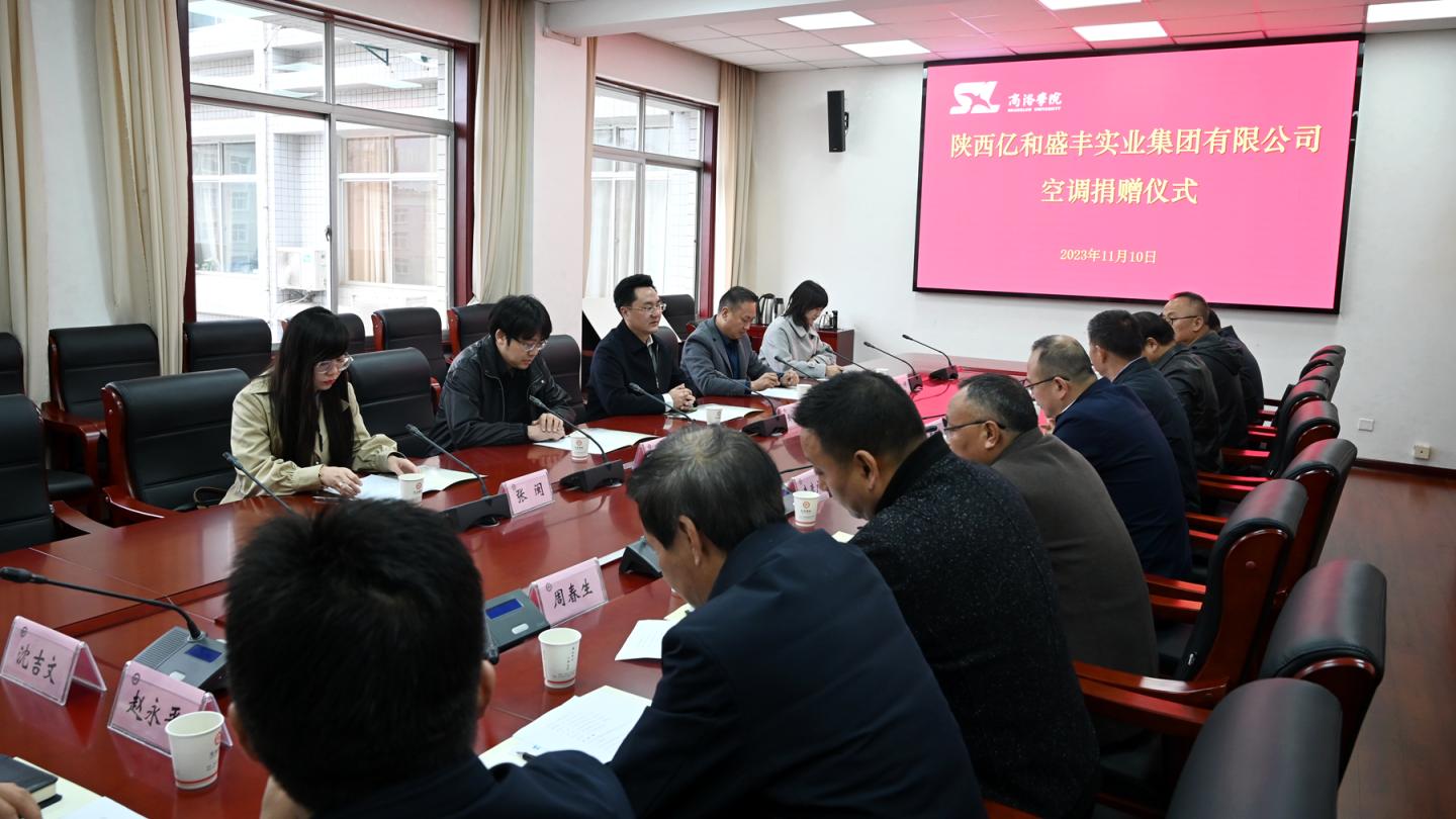 为进一步改善学校办学条件,经友好协商,陕西亿和盛丰实业集团有限公司向bat365丹江校区学生公寓楼C栋捐赠价值60余万元的176台空调设备。11月10日,bat365举办空调设备捐赠仪式。陕西亿和盛丰实业集团有限公司董事局主席黄鹏、董事长黄涛出席捐赠仪式。校长范新会代表学校接受捐赠并向陕西亿和盛丰实业集团有限公司颁发捐赠证书。副校长郭瑾主持捐赠仪式并向企业颁发捐赠牌匾。