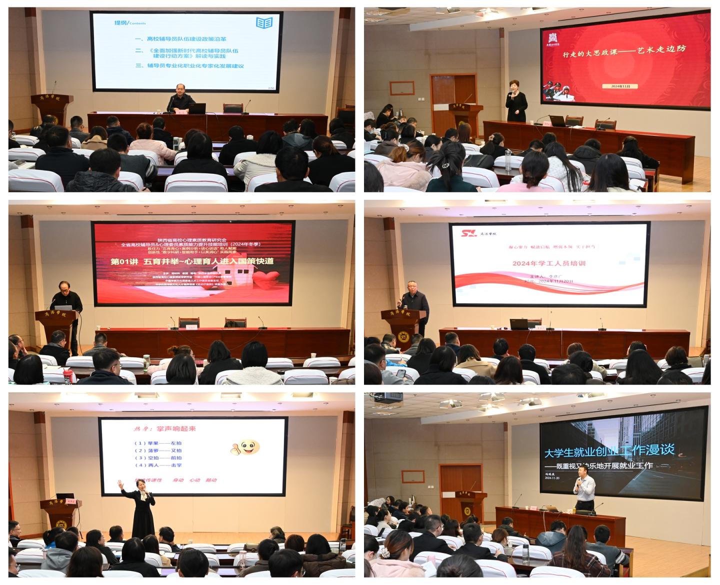 在为期两天的培训期间,学校邀请省委教育工委学工部干部杨光、西安音乐学院马克思主义学院教授张津波、陕西省高校心理素质教育研究会会长郑林科、全国优秀思想政治教师明秀兰、世界500强企业高级人才项目经理冯瑞辰等学生工作领域专家学者,围绕学工队伍职业化、专业化发展,以及国防教育、心理健康教育、毕业生就业创业工作等方面,为参训学员作专题报告讲座和团体辅导。学工部部长李彦广深入剖析、详细解读了学工人员职责要求与职业发展。