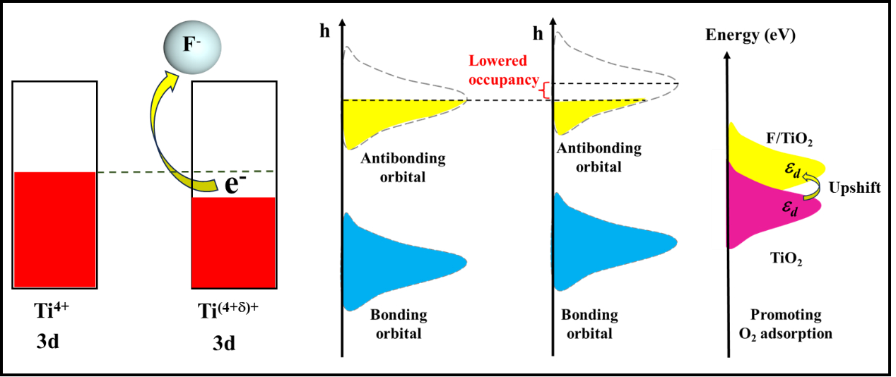 该研究指出,金属的d带能级高低决定了催化剂表面活性位点对小分子物质的吸附强度,能级越高,催化剂对小分子物质的吸附能力越强。该研究通过F掺杂提升TiO2的d带中心,提高了TiO2对O2的吸附性能,从而增强了TiO2光催化产H2O2的活性。