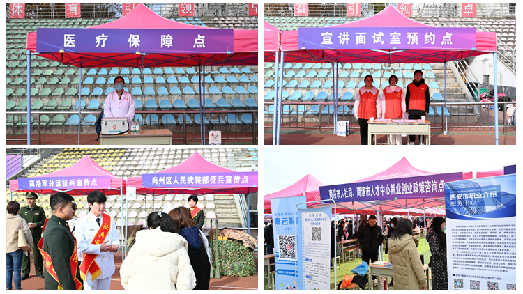 商洛军分区副司令员陆乐乐、商州区人武部上校政委高运锋、商洛市人社局四级调研员张利民、商洛市就业管理局副局长李荣军、商洛职业技术学院学生处处长张静、商洛市人才中心副主任董毅、西安市职介中心公共就业服务部副部长邓方园等参加了招聘会有关活动。