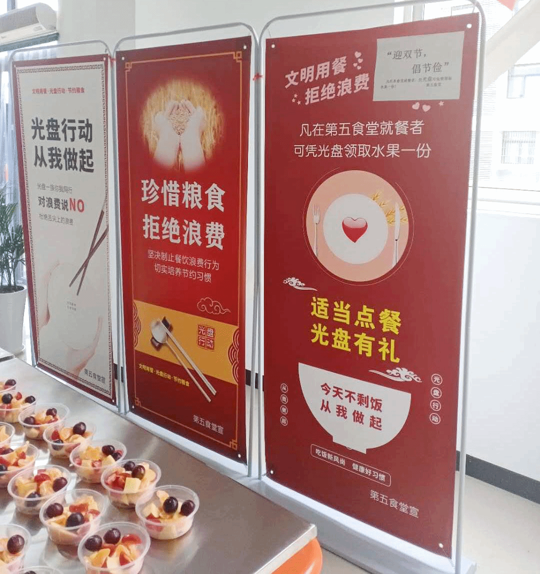 ——在全校食堂持续开展“光盘行动”。各食堂陆续通过光盘换水果、换饮料、换小饰品的活动,积极引导师生按需点餐、避免浪费,不剩饭、不剩菜,节约粮食、珍惜粮食,并以此为抓手扭转餐饮浪费的不良风气,引导师生关注参与餐饮节约,推动“光盘行动”常态化。
