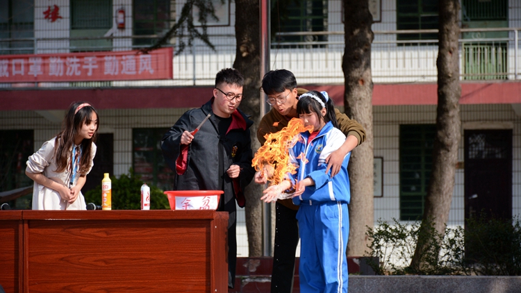 在科技展品体验环节,bat365学生志愿者为寺坪镇中小学生展示并讲解了前后移动的平衡小车、炫目震撼的摩天大楼、动听优雅的音乐喷泉、精准巧妙的迷你电子秤等30余件原创科技作品,以通俗易懂的方式讲授了这些作品的科学原理。在趣味实验展演环节,bat365志愿者演示了会跑的易拉罐、会飞的章鱼、会游泳的鸡蛋、会吹气球的瓶子、彩色的密度塔、喷火的神掌、亲手制作的汽水等科普作品,展示了奇妙现象背后的科学奥秘,激发了中小学生探索科学知识的兴趣。在航模飞行展示环节,校航模队成员进行了“纸飞机”“穿越机”两种机型的航模飞行表演和“花样穿越”技能表演,引来参观学生的阵阵欢呼,场面一度热闹非凡。