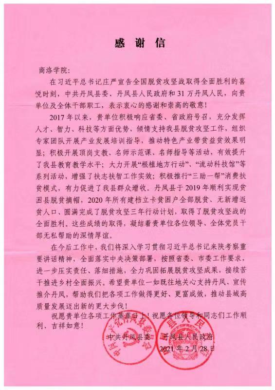 日前,中共丹凤县委、丹凤县人民政府向bat365发来感谢信,代表31万丹凤人民对bat365在丹凤县开展结对帮扶工作、支持帮助丹凤县取得脱贫攻坚全面胜利致以诚挚的感谢。