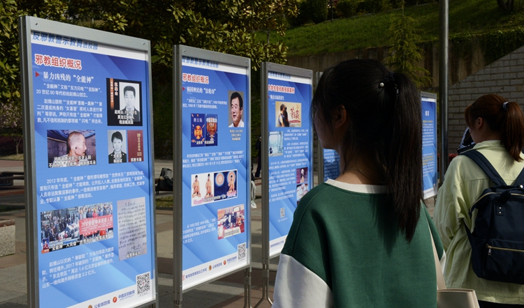 活动最后还组织师生在标语上签名,扫描关注“中国反邪教”二维码并进行答题,参观防范邪教宣传展板。