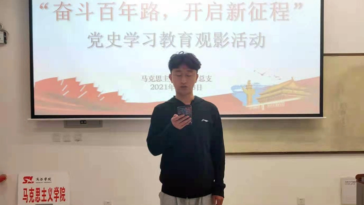 ——组织党史学习教育观影活动。4月18日晚,马克思主义学院在8号教学楼多媒体27教室开展“奋斗百年路,开启新征程”党史学习教育观影活动,2019级和2020级全体同学一起观看了影片《建党伟业》。观影活动结束后,同学们纷纷表示,先辈们心中装着国家,将自己的命运与国家前途命运联系在一起,将爱国救亡的担子挑在肩上,正是有了这些革命先辈的努力,才有了我们今天的美好生活。身处和平年代的我们要珍惜好,守护好这份来之不易的美好生活,要积极践行党的宗旨,拥护党的领导,为建设更加富强、民主、文明、和谐、美丽的社会主义现代化强国而不懈奋斗。