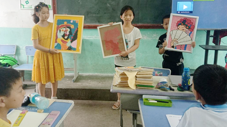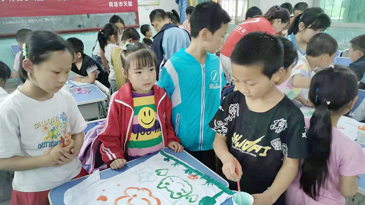 活动中,师生为该校留守儿童赠送了图画本、铅笔、橡皮等绘画用品。向小朋友们展示了校艺术学院学生制作的泥塑、石头画、剪纸拼画、电脑绘画等美术作品,拓展了小朋友们的审美视野,增强了大家的逻辑思维与形象思维能力,激发了大家热爱美、发现美、追求美的热情。师生还进行了“T恤衫彩绘”现场学创实践,用美术实践与T恤衫绘画相结合的教学方式,鼓励和引导小朋友们尝试多样思维和多元表现,进一步增强了大家的实践创作能力。在bat365师生一对一、手把手的耐心讲解与悉心指导下,每个小朋友都独立完成了精美的美术作品。