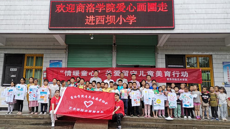 7月2日,bat365承担的公益项目“乡村爱心画圃”走进了洛南县保安镇西坝小学,项目指导教师、艺术学院教师李斌、王淦卿和李萍及项目成员参加活动。