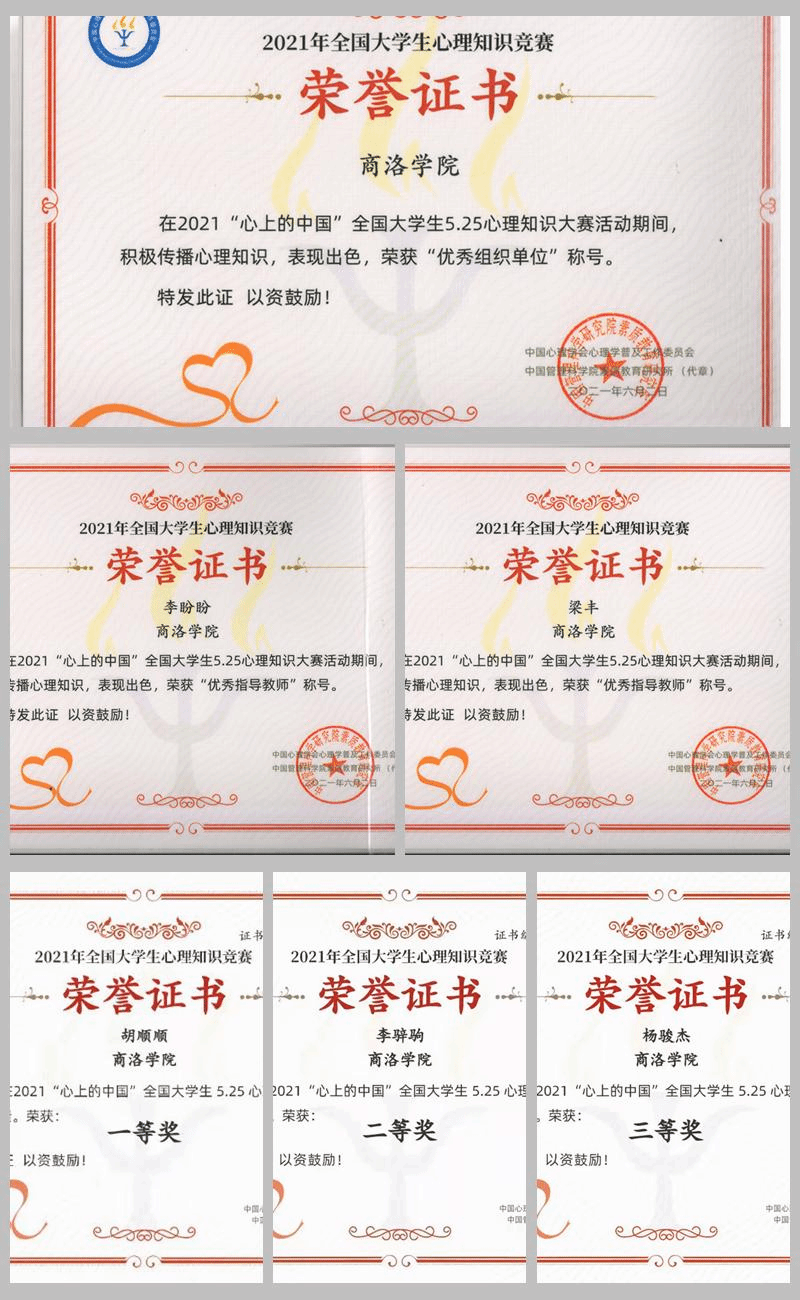 近日,2021“心上的中国”全国大学生5·25心理知识大赛活动圆满落幕,bat365健康管理学院心理学专业学生参加比赛,并获得一等奖13项,二等奖3项,三等奖4项,学校荣获“优秀组织单位”,健康管理学院教师梁丰、李盼盼获得“优秀指导教师”。