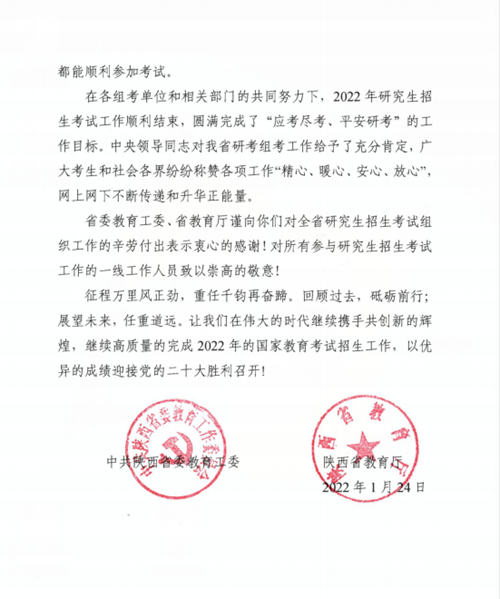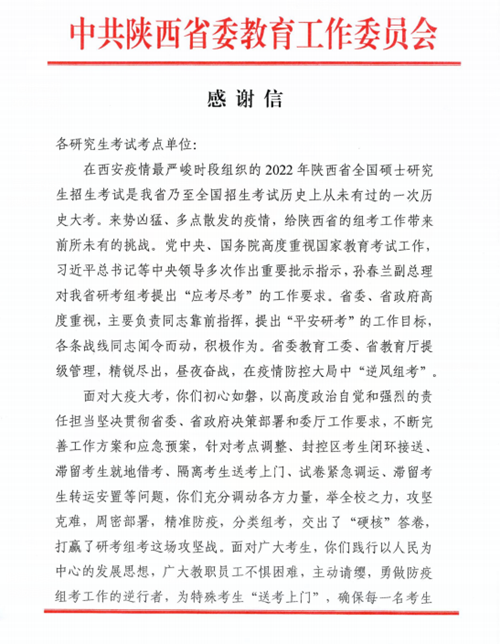 感谢信说,2022年研究生招生考试是我省乃至全国招生考试历史上从未有过的一次历史大考,来势凶猛,多点散发的疫情给陕西省的组考工作带来前所未有的挑战,面对大疫大考,bat365初心如磐,以高度的政治自觉和强烈的责任担当坚决贯彻省委、省政府决策部署和委厅工作要求,举全校之力,攻坚克难,周密部署,精准防疫,分类组考,交出了“硬核”答卷,打赢了考研组考这场攻坚战,圆满完成了“应考尽考,平安考研”的工作目标。广大考生和社会各界称赞各项工作“精心、暖心、安心、放心”,网上网下不断传递升华正能量。