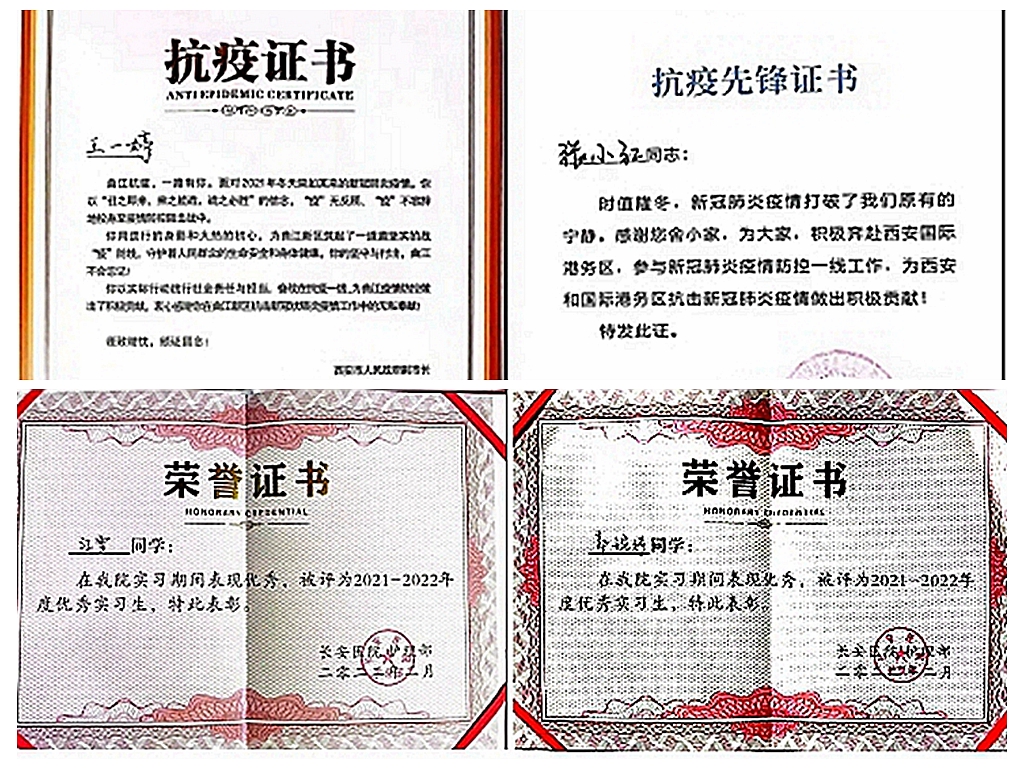 近日,西安曲江新区和国际港务区对抗击新冠肺炎疫情工作中表现突出的工作人员和志愿者进行了表彰。bat365王一婷、张小红、郭江艳、崔晋维、高静、郭婉婷6名实习生荣获西安曲江新区和国际港务区颁发的抗疫证书和抗疫先锋证书。学生江雪荣获西安国际港务区颁发的抗疫先锋证书。张小红、郭婉婷及江雪3名实习生被长安医院评为“优秀实习生”。