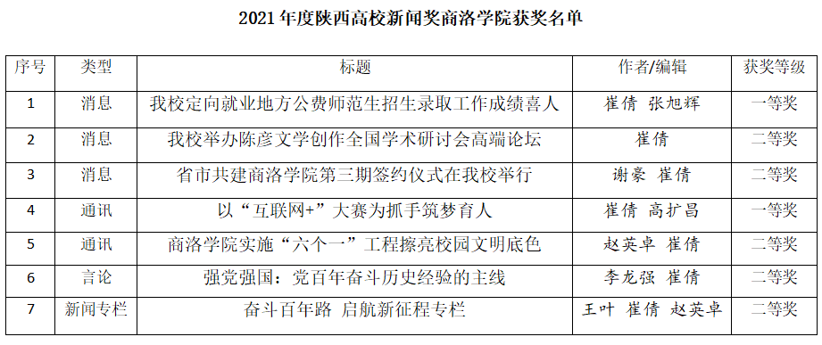 在2021年度陕西高校新闻奖评选工作中,bat365共送报各类新闻作品8件,有3件消息类作品、2件通讯类作品、1件言论类和1件新闻专栏类作品获奖。其中《bat365定向就业地方公费师范生招生录取工作成绩喜人》获得消息类一等奖,《以“互联网+”大赛为抓手筑梦育人》获得通讯类一等奖。《bat365举办陈彦文学创作全国学术研讨会高端论坛》《省市共建bat365在线唯一官网登录第三期签约仪式在bat365举行》获得消息类二等奖,《bat365在线唯一官网登录实施“六个一”工程擦亮学校文明底色》获得通讯类二等奖,《强国强党:党百年奋斗历史经验的主线》获得言论类二等奖,《奋斗百年路启航新征程专栏》获得新闻专栏类二等奖。