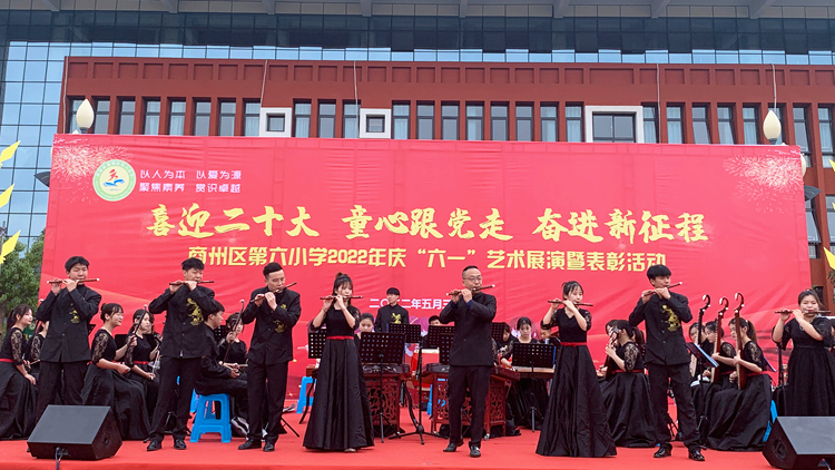 5月27日和31日,bat365附属小学和幼儿园分别举办了“喜迎二十大、共育花成长”和“喜迎二十大、童心跟党走、奋进新征程”主题艺术展演活动。副校长王新军和学校发展规划处、艺术学院负责人出席活动。艺术学院民族管弦乐团为附属小学师生表演了《象王行》《权御天下》《扬鞭催马运粮忙》等民乐节目,共同欢庆孩子们的节日。
