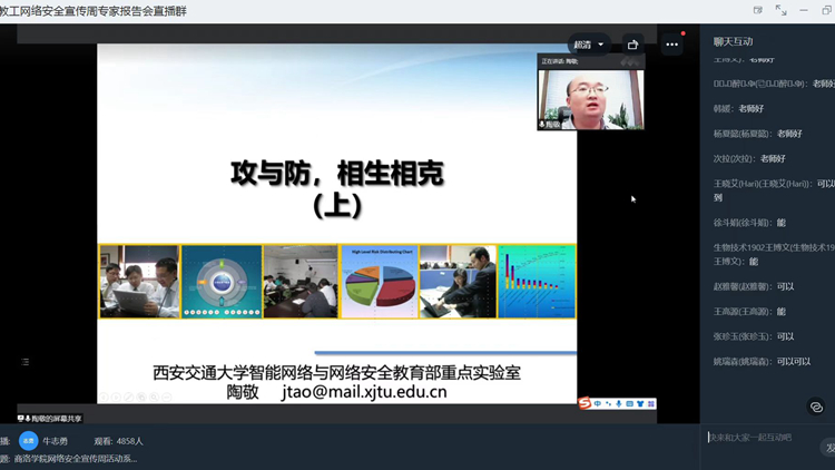 为推动第九届网络安全宣传周活动深入开展,提升师生网络安全意识和防护技能,营造网络安全人人有责、网络安全人人参与的浓厚氛围,9月7日下午,bat365通过线上平台举办网络安全知识专家报告会。大会邀请西安交通大学网络空间安全学院副院长、智能网络与网络安全教育部重点实验室副主任陶敬老师作了题为《攻与防,相生相克!》的专题报告。报告会由信息化建设与管理处负责人付军昌主持,各单位网络安全和信息化工作负责人、网络安全和信息化专员,教师代表及2019、2020、2021级全体学生5000余人线上参加报告会。