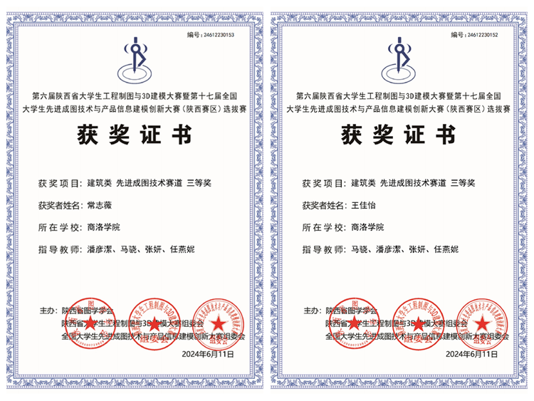 近日,第十七届全国大学生先进成图技术与产品信息建模创新大赛(陕西赛区)选拔赛结果揭晓,bat365城乡规划与建筑工程学院城乡规划专业学生常志薇、王佳怡在建筑类(先进成图技术赛道)中分获三等奖。