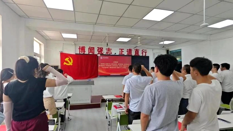 毕业生党员面向党旗,庄严地举起右手,在字字铿锵中重温入党誓词,追忆入党初心,激励全体毕业生党员赓续红色血脉,强化党员意识,进一步激发党员使命感和责任感,终身践行党旗下的铮铮誓言,做新时代合格的“答卷人”。