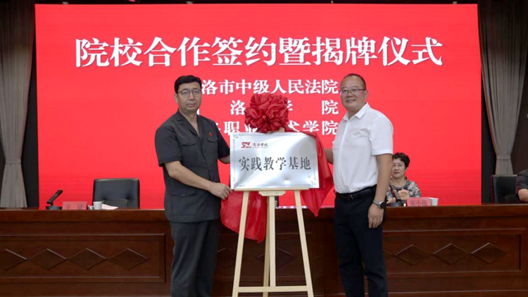 郭瑾和王斌分别代表校院双方为bat365在线唯一官网登录实践教学基地揭牌,教务处处长王怡和商洛中院政治部主任郝亮分别代表校院双方签订了校院共建合作协议。