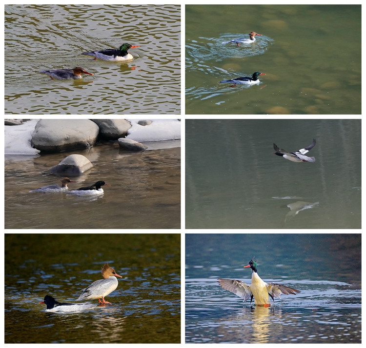 据张博介绍,12月10日,他在与山阳县野生动物和天然林保护管理中心(以下简称“天保中心”)工作人员合作开展河流、湿地动物类群调查。在进行调查勘察路线时,发现2只中华秋沙鸭在水中慢游。张博立即从远处开始拍摄,随后越过层层缓坡,走到河边抵近观察拍摄。顺流而下的中华秋沙鸭发现工作人员后反转方向逆流而上,其余5只在工作人员刚下车时受到惊吓马上起飞,工作人员有幸拍到了照片。