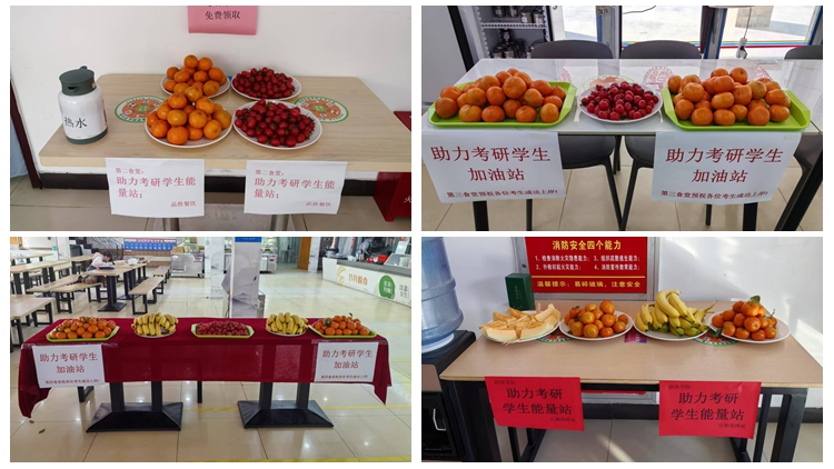 各学生食堂设立“考研加油站”,为考研学生免费提供各类水果,冬至当天,教工食堂为研究生招生考试考务人员及工作人员提供了手工水饺。