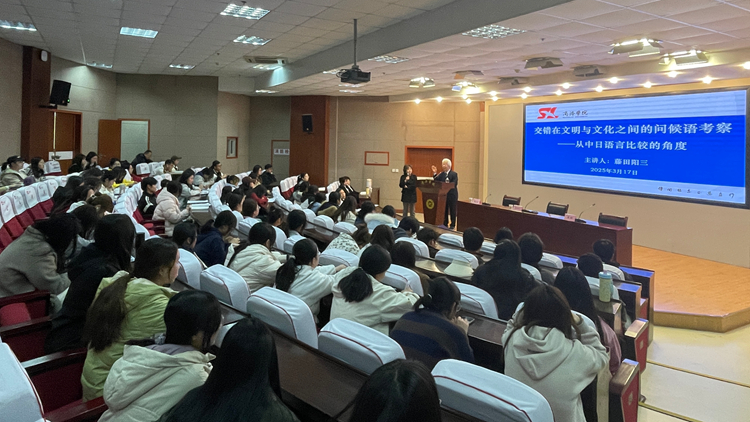 报告会上,藤田阳三教授以《交错在文明与文化之间的问候语考察——从中日语言比较的角度》为题,通过列举实例,详细对比了中日问候语在表达方式、使用场景和蕴含寓意上的异同。他认为,国家和地区的文明和文化都融合在语言之中,问候语作为人际沟通交流的开始,能清晰映照出中日两国在社会结构、价值观念上的区别,具有重要意义,青年学子要感受、体验不同的文化魅力,为中日两国的友好交流作出贡献。陕西师范大学外国语学院日语教师王红作报告会现场翻译。