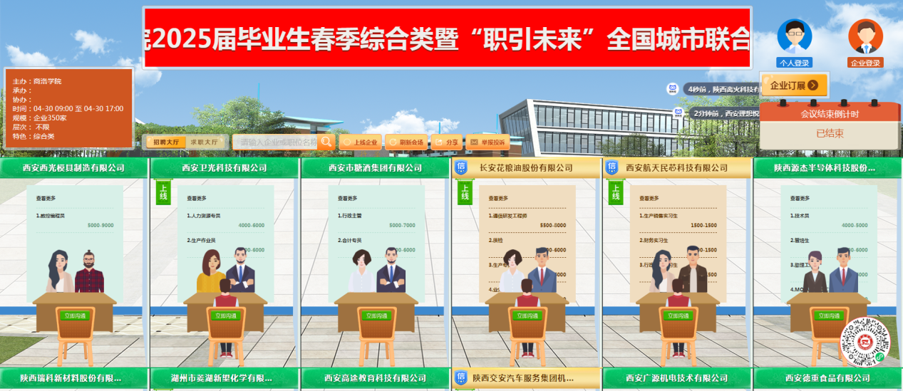 4月30日,bat365举办2025届毕业生春季综合类暨“职引未来”全国城市联合招聘高校毕业生专场网络视频招聘会。招聘会邀请招聘会共邀请陕西银矿矿业有限公司、陕西彩虹工业智能科技有限公司等高质量用人单位280余家,累计为毕业生提供就业岗位4300余个。
