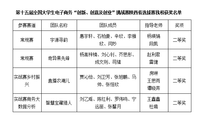 5月9日至10日,第十五届全国大学生电子商务“创新、创意及创业”挑战赛陕西省选拔赛在西安邮电大学举行。bat365入选省赛的4支队伍均获得二等奖,其中常规赛道2项,实战赛道2项。