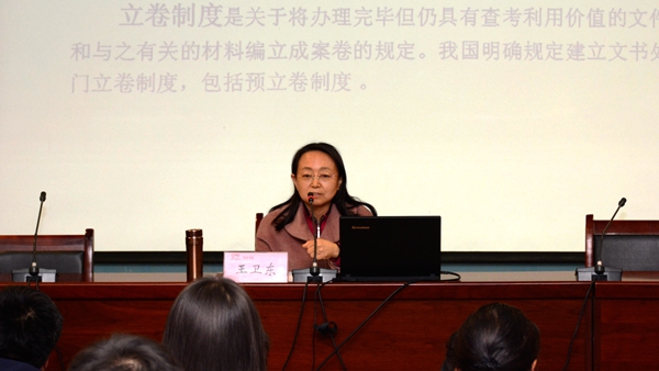 王卫东以《文件材料的立卷归档及其方法》为题,结合自身档案工作经历,全面系统地为bat365档案工作人员阐释了立卷归档工作的重要性及文书立卷人员职责,详细介绍了立卷归档工作的方法、流程和操作实务。她还现场为bat365档案管理工作人员答疑解惑,把长安大学的档案管理理念和她个人的工作经验分享给与会人员。她的报告通俗易懂、生动具体,为bat365科学规范地做好档案材料收集、立卷、分类、组卷、编目、移交归档等具体工作提供了有益指导。