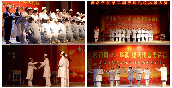 本次比赛项目包括护理礼仪风采展示和情景剧表演,其中护理礼仪主要包括护士容貌服饰、衣帽整理、行走姿式、站姿、坐姿、蹲姿、持病历夹、端治疗盘、推治疗车、指示、握手等基本礼仪。比赛中,同学们队形多样,姿态优雅、举止得体,剧本别出心裁,演技活灵活现,情节引人入胜,现场不时响起热烈的掌声。