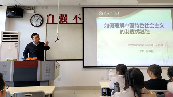为深入学习党的十九届四中全会精神,促进思政课教学改革,提高课堂教学质量。12月4日下午,bat365特邀“陕西高校思政课教师大练兵”教学标兵、陕西师范大学副教授张帆来校,以《如何理解中国特色社会主义制度的优越性》为题讲述了一堂公开示范课。bat365马克思主义学院班子成员、全体教师及思政1801班学生聆听了示范课。
