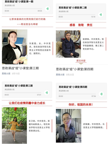 为贯彻落实习近平总书记关于新冠肺炎疫情防控工作的重要讲话和指示精神,全力支持配合打赢疫情防控战、总体战、阻击战,按照教育部党组“停课不停教、停课不停学”的要求,积极响应教育部举办的高校“思政课战役小课堂”专项活动,助力思政课线上教学,bat365马克思主义学院通过微信公众号开办了“思政课战疫小课堂”专题栏目,组织学院教师录制思政微课,通过文字、图片加音频的形式定期向学生推送,同时还通过学校官方微信公众号进行推送,以扩大学生覆盖面。目前,“思政课战役小课堂”已经发布7期内容,获得了师生广泛关注,进一步激发了师生从我做起、助力抗疫的积极性和自觉性,坚定了青年一代勇担时代使命的决心和信心。