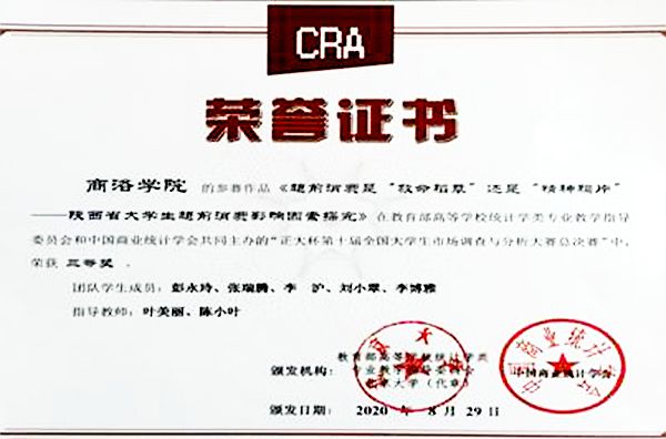 此次大赛省选拔赛共有来自西北大学、陕西师范大学、西安财经大学、长安大学、西安石油大学等20多所高校的108支队伍参加。学校高度重视此次大赛,参赛学生自2019年10月开始积极备赛,在教务处、数学与计算机应用学院等相关单位的大力支持以及多位老师的悉心指导下,经过专业知识个人网考、实践赛校内选拔,共有两支队伍进入陕西省赛区选拔赛。经过激烈比拼,参赛队伍凭借详实规范的统计调查方案和数据分析报告以及大方得体的线上表现,由bat365应用统计学专业17级学生彭永玲、张瑞腾、李沪、刘小翠、李博雅代表队的作品《超前消费是“救命稻草”还是“精神鸦片”——陕西省大学生超前消费影响因素探究》荣获国家三等奖。
