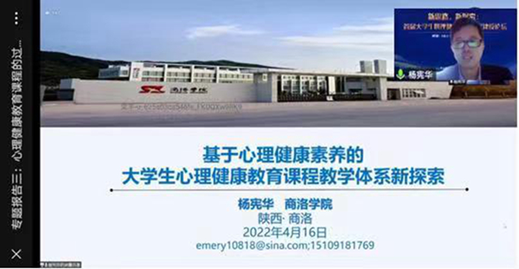 4月16日至17日,中国心理卫生协会大学生心理咨询专委会联合国家社科基金重大项目“国民心理卫生素养及其提升机制与对策”项目组举办全国“新思路,新探索:首届大学生心理健康教育课程建设论坛” 线上学术论坛,bat365健康学院杨宪华副教授受邀在“专题报告”环节作交流发言。