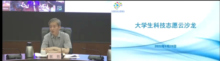 郭哲在讲话中指出,科普工作不仅仅传递知识,更要引领报效国家的爱国情怀。各高校要将科技志愿服务融入思想政治教育体系,发扬奉献、友爱、互助、进步的志愿服务核心价值,传递爱国、创新、求实、奉献协同育人的科学家精神,引领大学生走进社区、走进学校、走进企业,服务好老年群体、产业工人、农户、青少年等不同群体,通过常态化科技志愿服务,使广大青年大学生得到实践与锤炼,为全社会文明进步作出扎实的贡献。