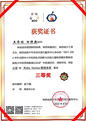 由共青团陕西省委、陕西省教育厅、陕西省少工委主办的2021-2022学年全国中小学信息技术创新与实践(NOC)大赛陕西赛区分赛结果于近日揭晓。经济管理学院教师赵子越指导的商洛市小学团队获得陕西赛区人工智能类Robo Genius智造未来赛项小学组省级三等奖。这是在bat365公众科学素质与创新发展研究中心指导下,该校学生首次取得省级人工智能类赛事奖项。