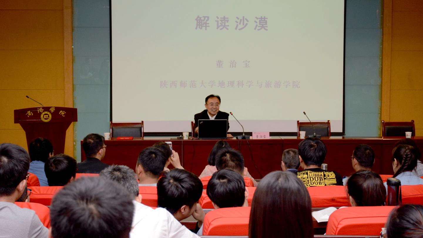 受聘仪式后,董教授以“解读沙漠”为题作了学术报告。报告中,他从沙漠两字蕴含的文化、沙漠的形成、沙漠中水的作用、沙产业等方面,对沙漠进行了多维度的深入解读。报告幽默风趣、内容新颖,获得在场师生阵阵掌声。董教授还与师生亲切互动,详细解答了师生提出的学术问题。