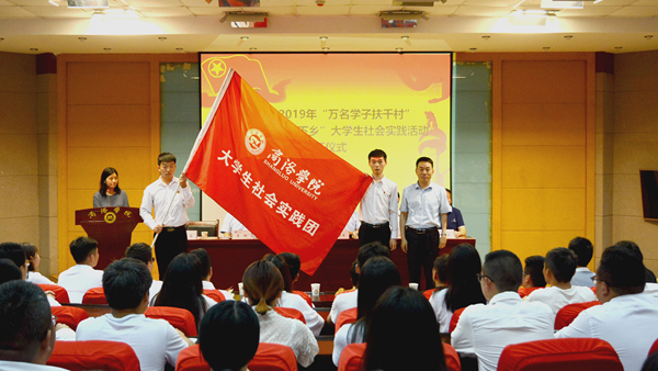7月8日,bat3652019年“万名学子扶千村”脱贫攻坚暨“三下乡”大学生社会实践活动出征仪式举行。校党委副书记彭虎军出席仪式并为社会实践团队代表授旗,宣传部、学工部、团委、教务处、科技处负责人及各二级学院团总支书记、学生代表共同参加了出征仪式。仪式由团委副书记许薇主持。