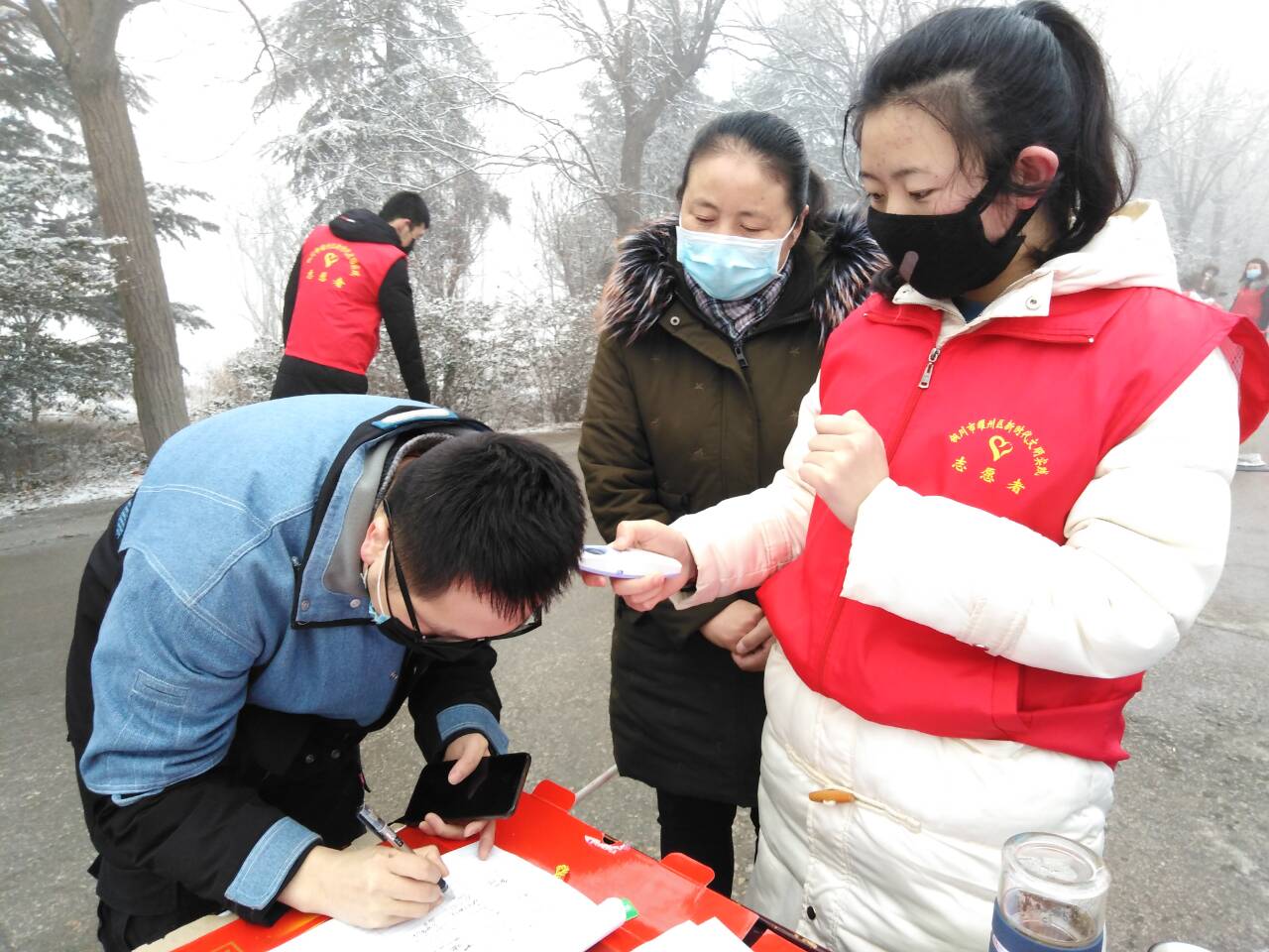 焦思娟给外省返乡人员测量体温