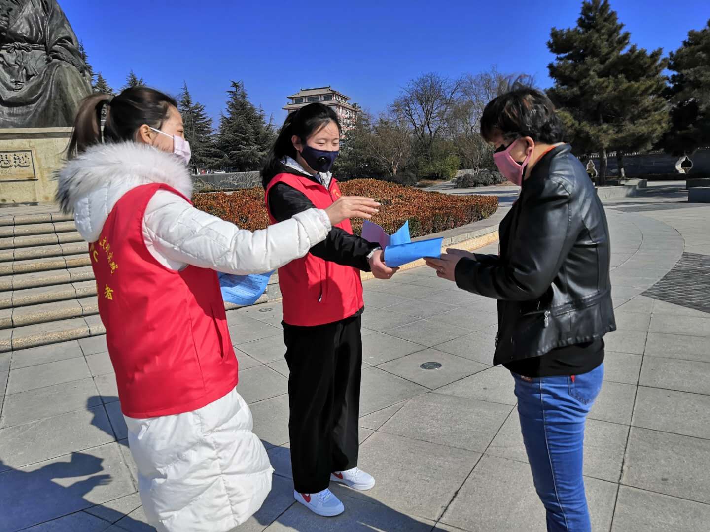 焦思娟与同伴一起发放疫情防控宣传册