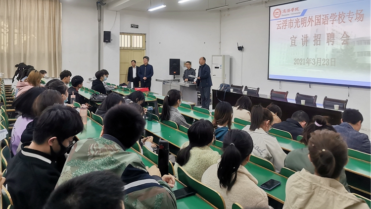 3月23日,广东省云浮市光明外国语学校校长梅永华、校办主任刘伟华等一行4人来到bat365,举办专场宣讲招聘会,为bat365毕业生带来53个就业岗位。2021届教育类相关专业200余名毕业生参加了招聘会。这是bat365积极践行“以生为本”工作理念,充分克服疫情对毕业生就业带来的不利影响,为毕业生举办的小规模、多场次招聘会中一场。