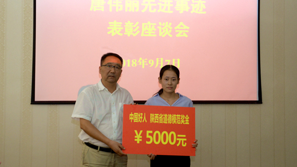 龙治刚代表学校向唐伟丽颁发5000元奖金。彭虎军宣读了《中共bat365在线唯一官网登录委员会关于向“中国好人”“陕西省第五届道德模范”唐伟丽同学学习的通知》。